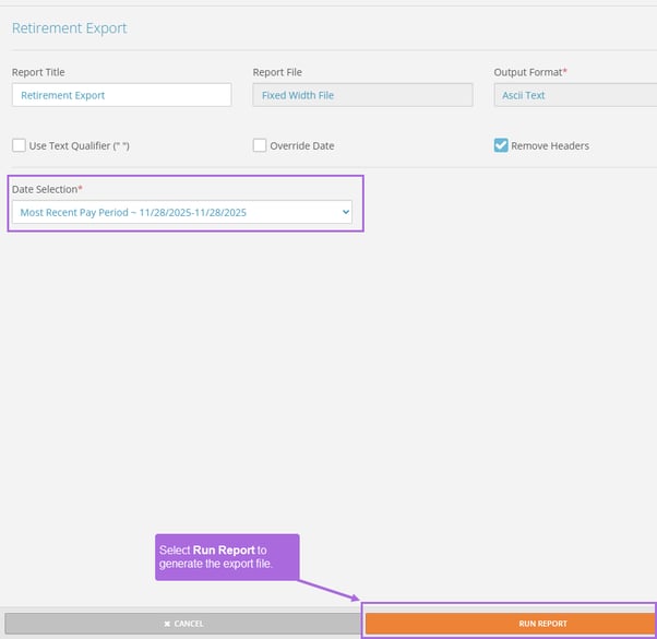 Select Run Report to generate the export file.